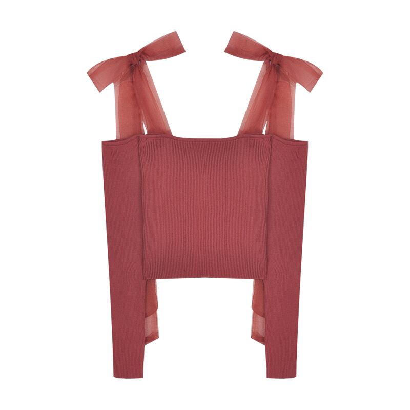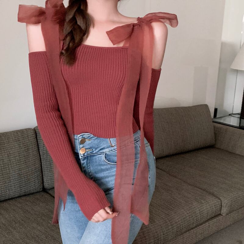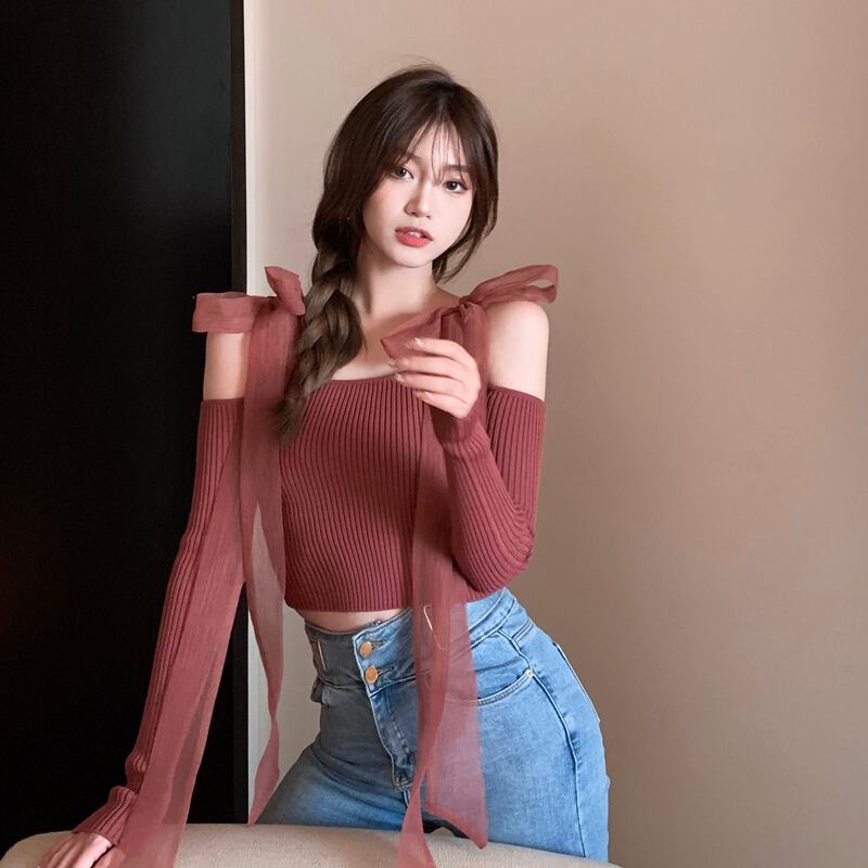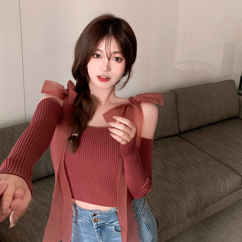 ニットセーター シャツ スプリングオータムストラップレスショートトップス ロング 春物 秋物 ブラックストロベリース21157305813