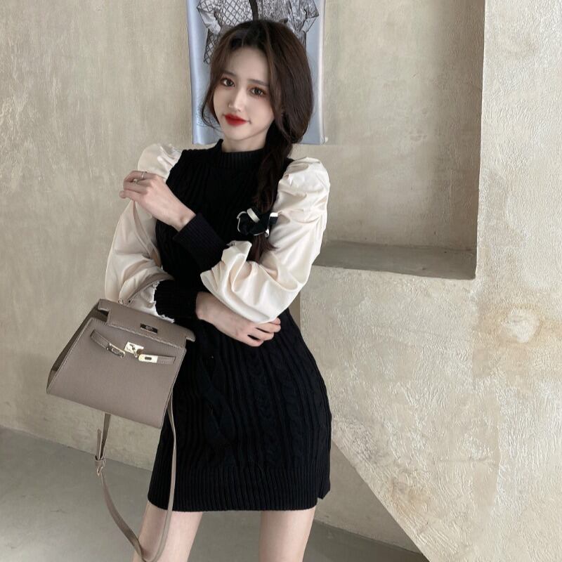 ニットセーター ドレス スプリングオータムショートスカート ブラックスリーブ長袖 ロング ランタンスリーブ 春物 秋物 ブラックストロベリース10837928931