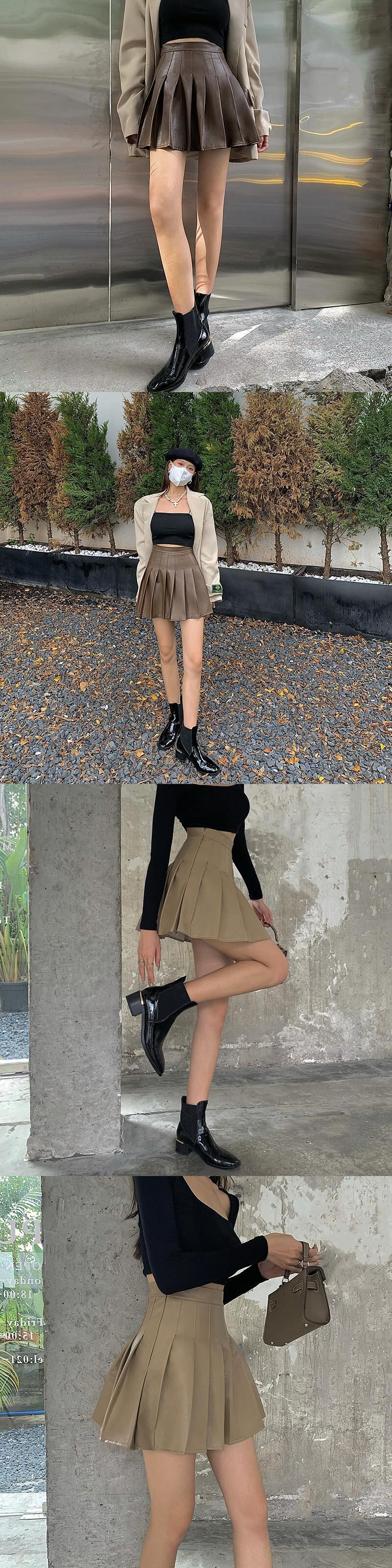 レザースカート ハイウェストウェスト薄手プリーツオータムジッパーブラックAライン 秋物 ブラックストロベリース46055083464