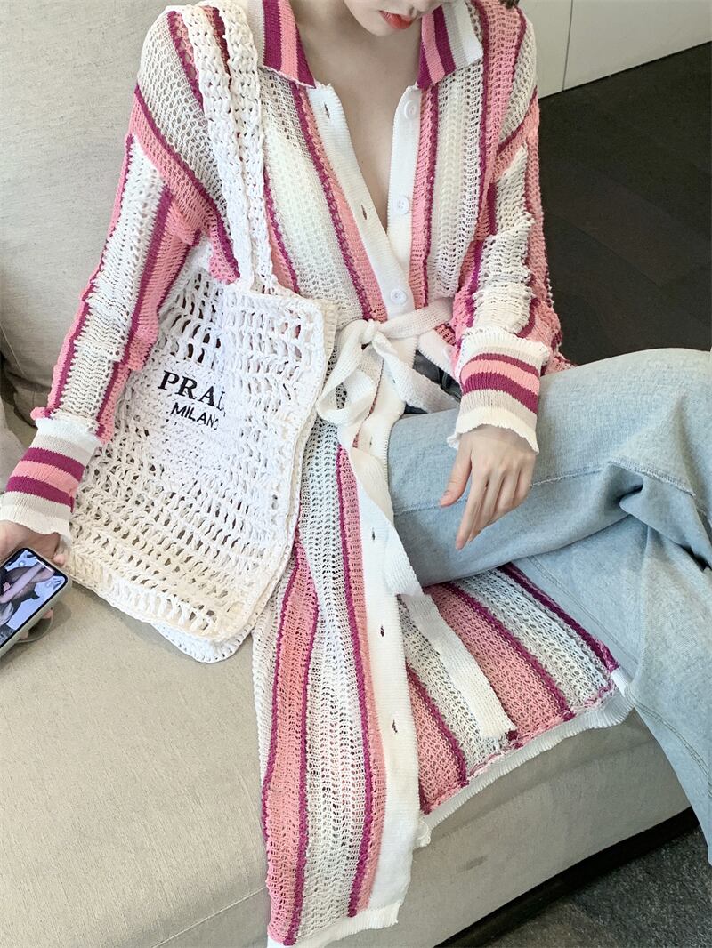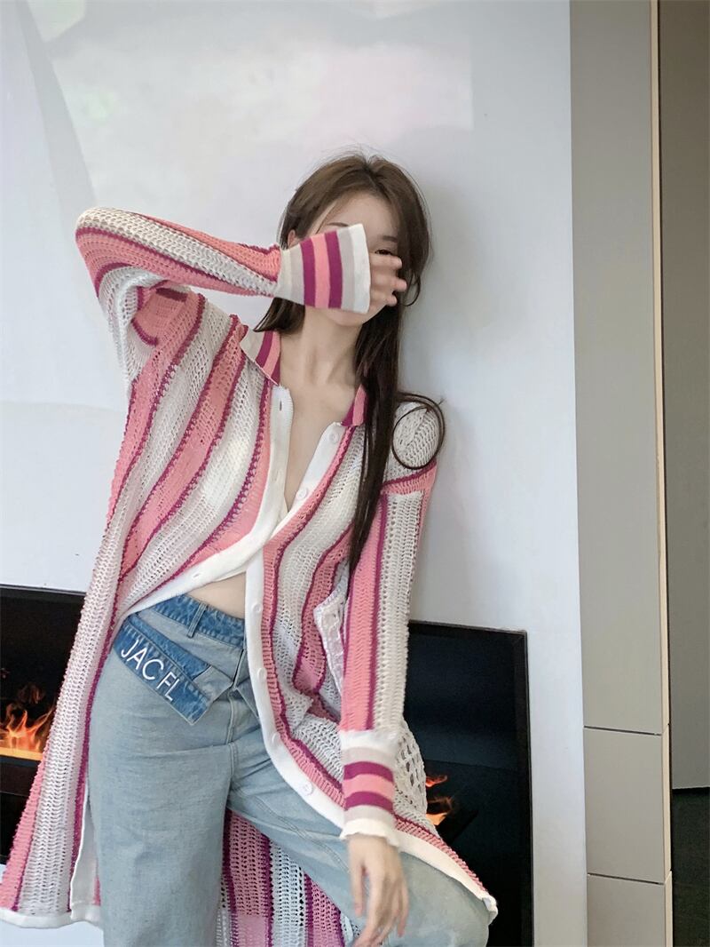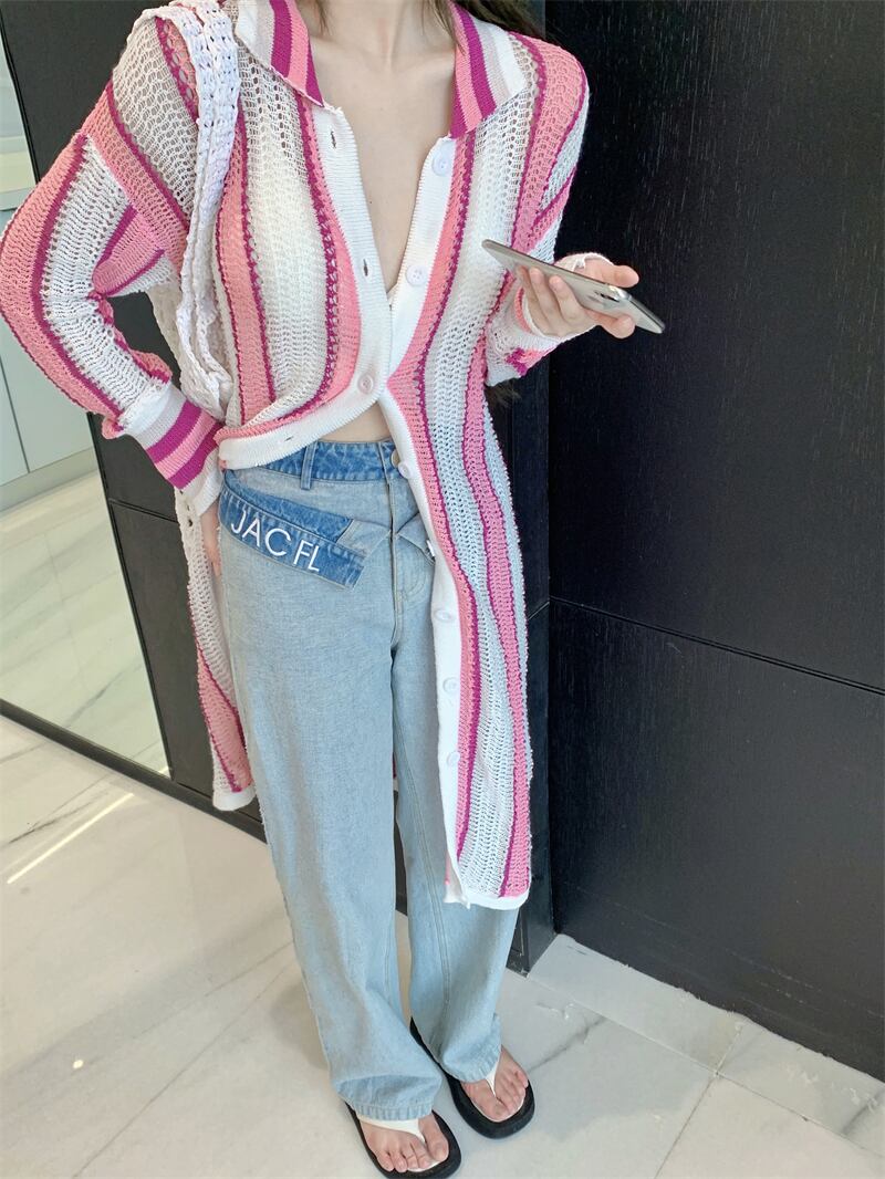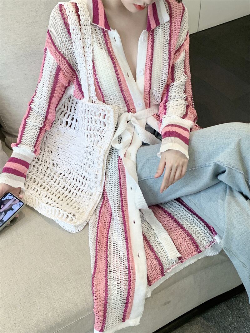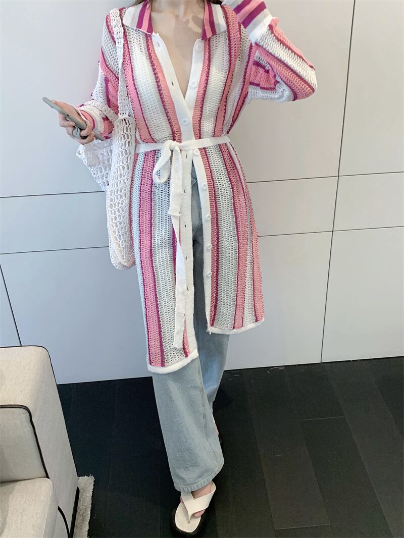 ストライプセーター カラールーズスタイルカーディガンジャケット オータムニットトップス ロング 秋物 ブラックストロベリース48050675426