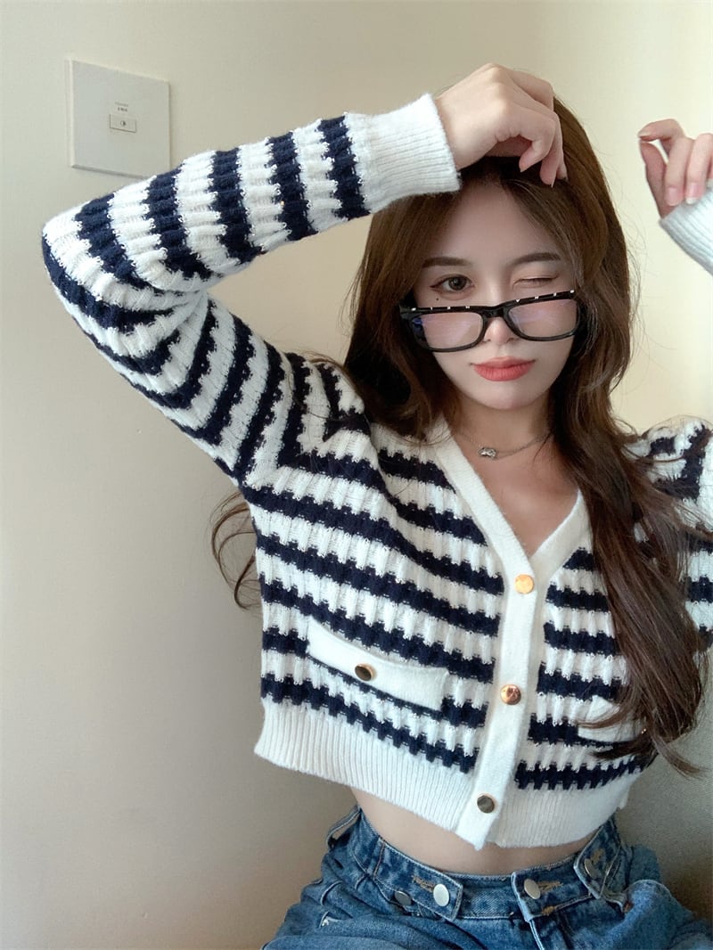 ストライプセーター ショートルーズカーディガンジャケット オータムVネックトップス ロング 秋物 ブラックストロベリース72781941842