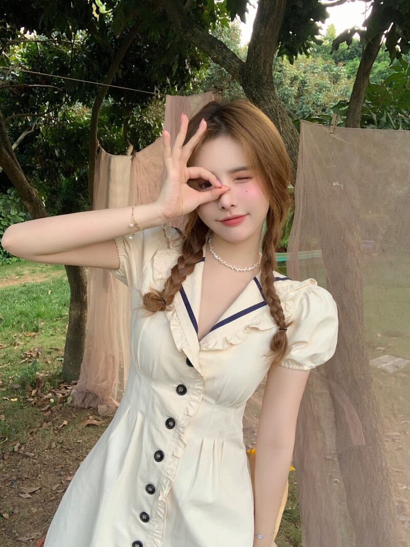 色:ベージュネイビードレス