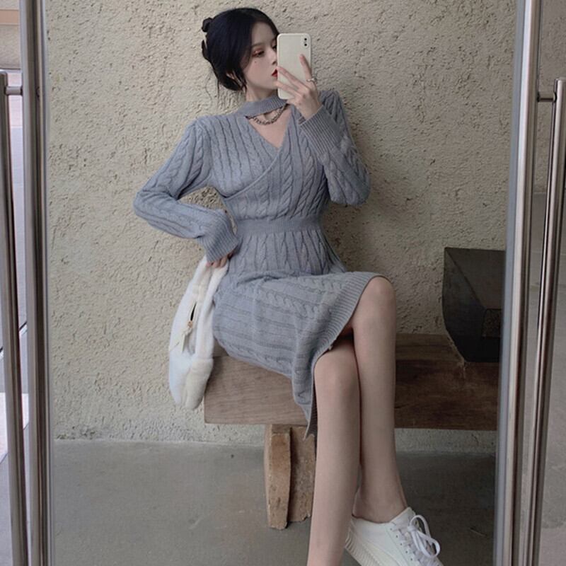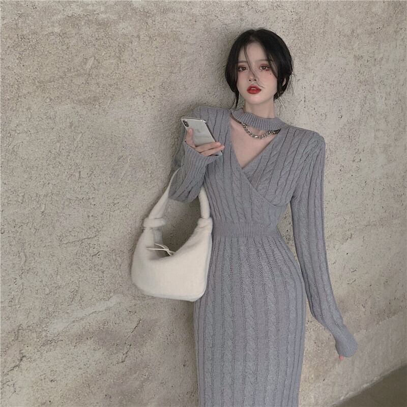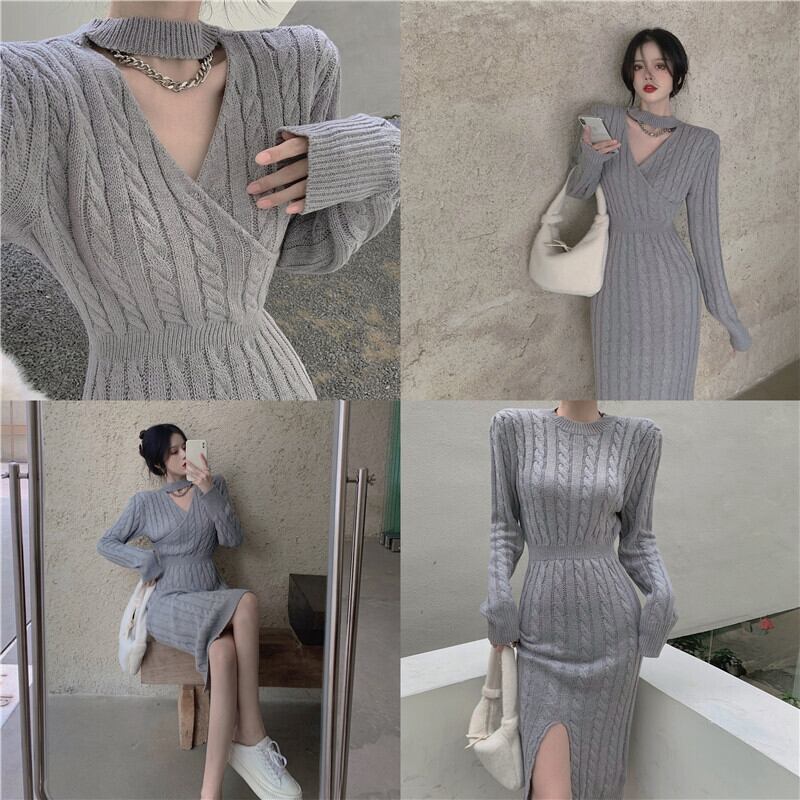 セーター ドレス ホルターVネックスカート オータム ロング 秋物 ブラックストロベリース95300966197