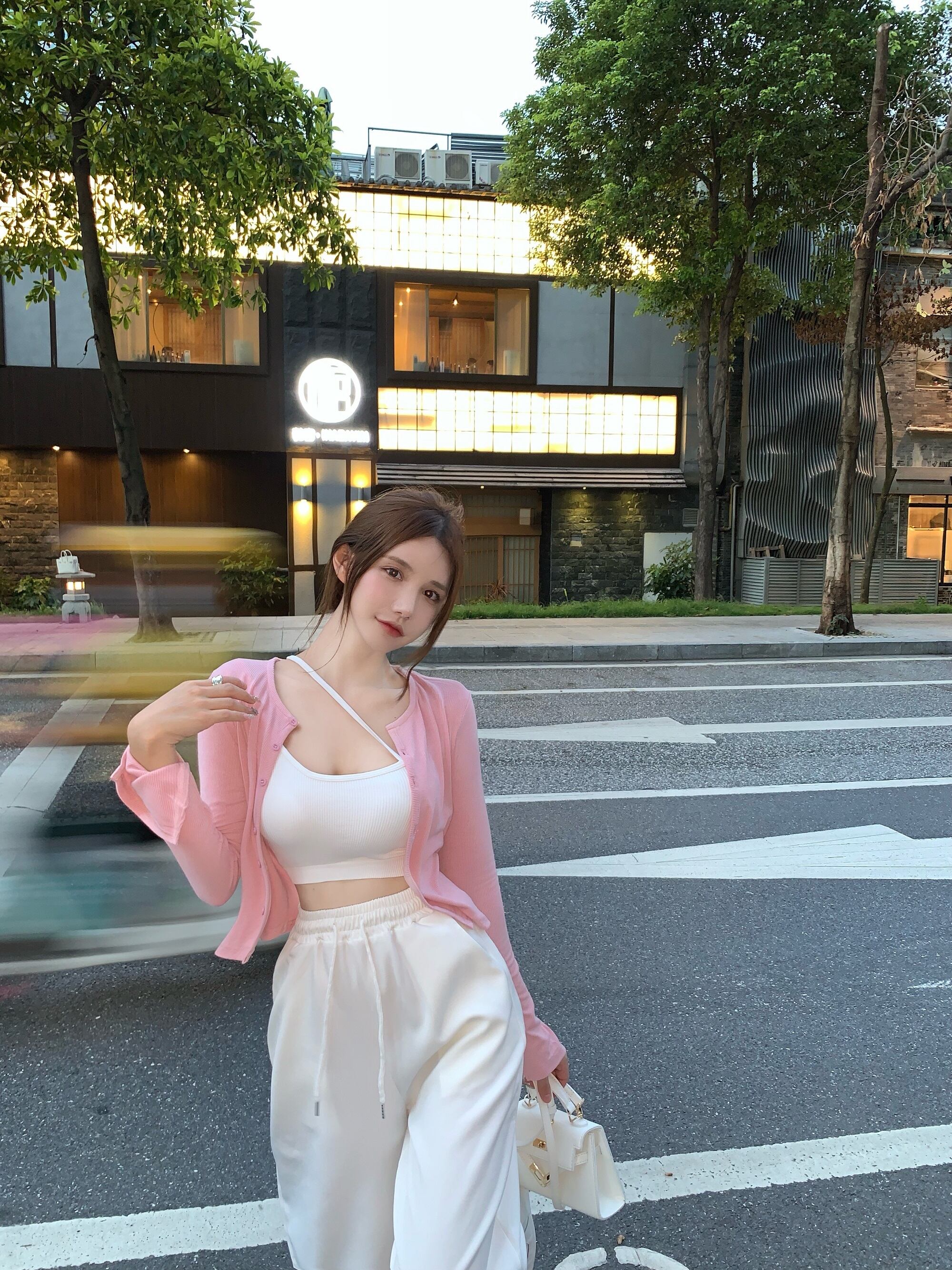 色:内側のスリング,ピンクのカーディガン,白いズボン