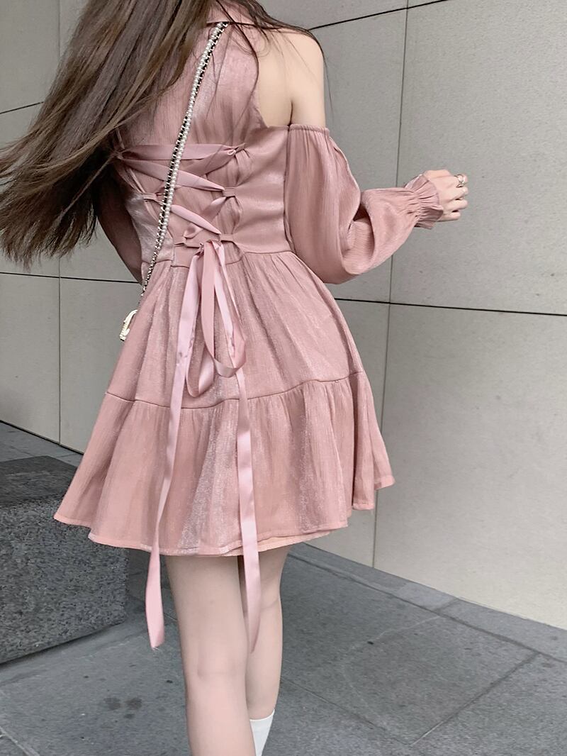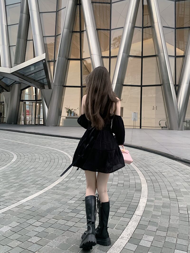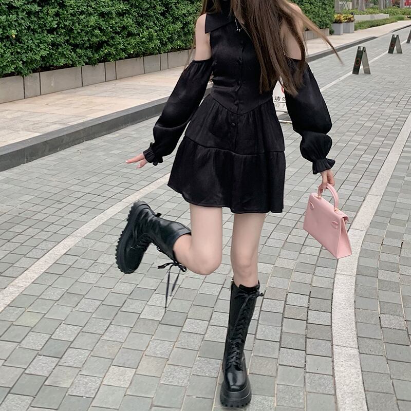 ホルターカラーシャツ ドレス ウェストストラップレスショートスカート オータム ロング 秋物 ブラックストロベリース84709679222