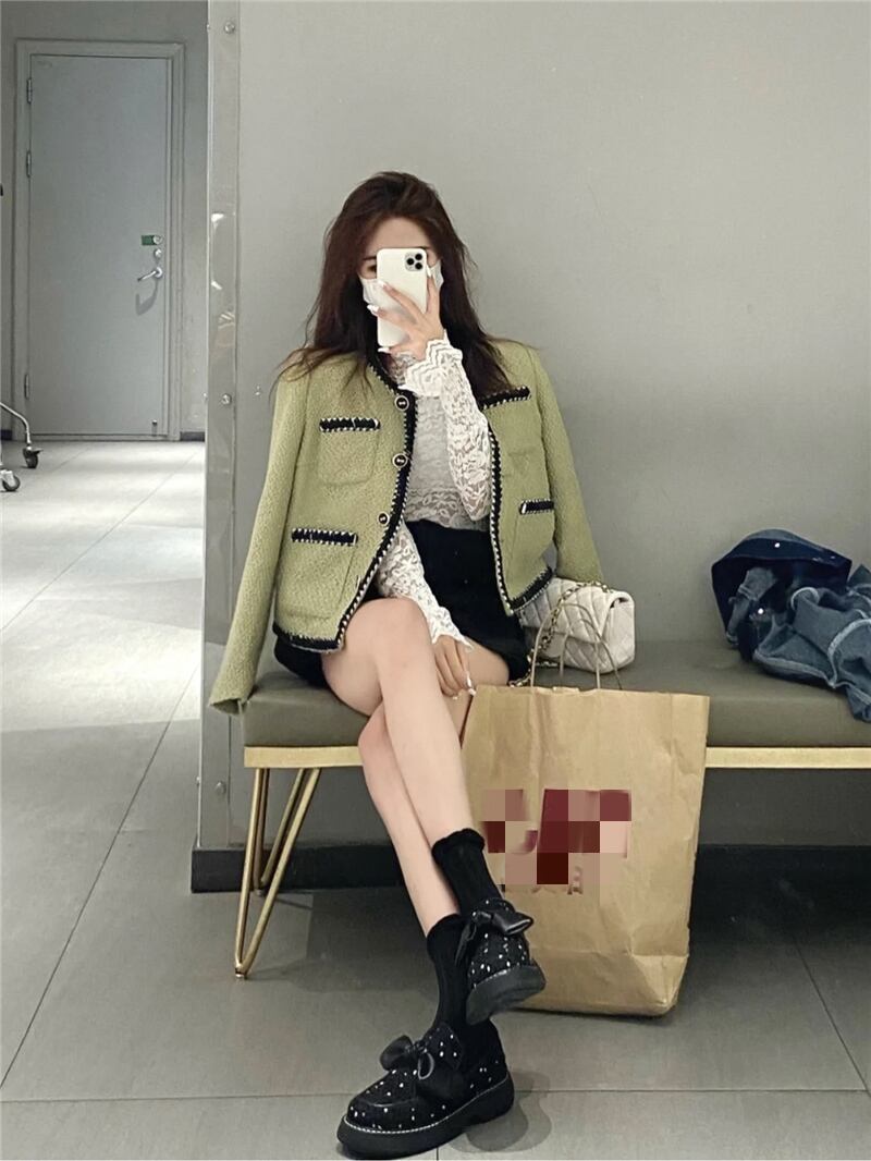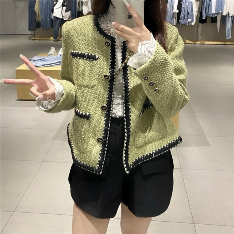 ショートツィードジャケット グリーンルーズカーディガンオータム 秋物 ブラックストロベリース35334751167