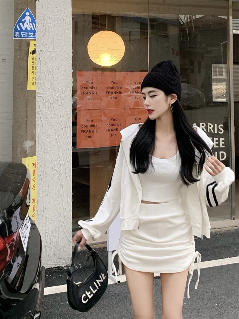 サイドストライプセーター レディースルーズショートフードジッパージャケット オータムホワイトトップス 秋物 ブラックストロベリース95176874021