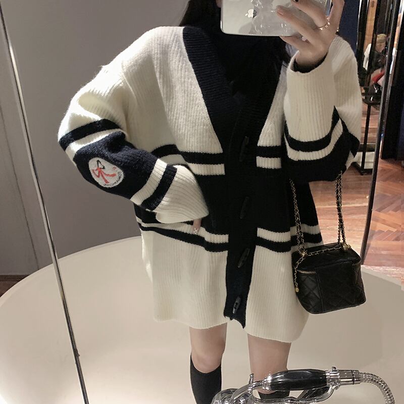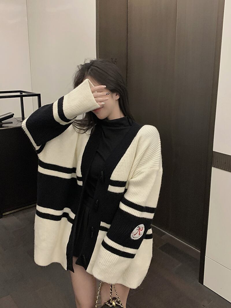 スタイルストライプニットセーター カーディガンジャケット オータムウィンターシャツ 秋物 冬物 ブラックストロベリース6748082155