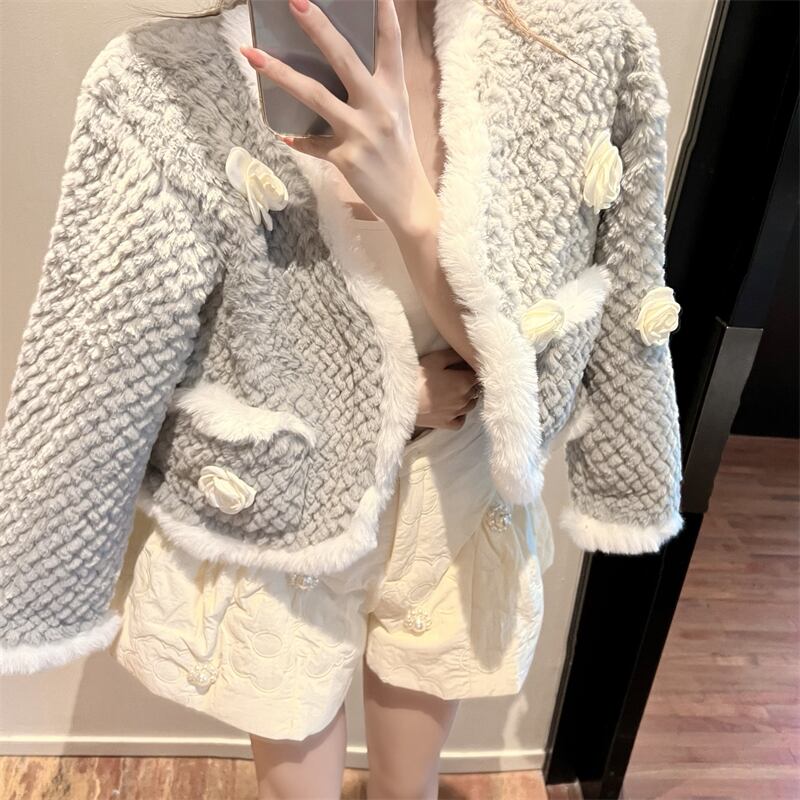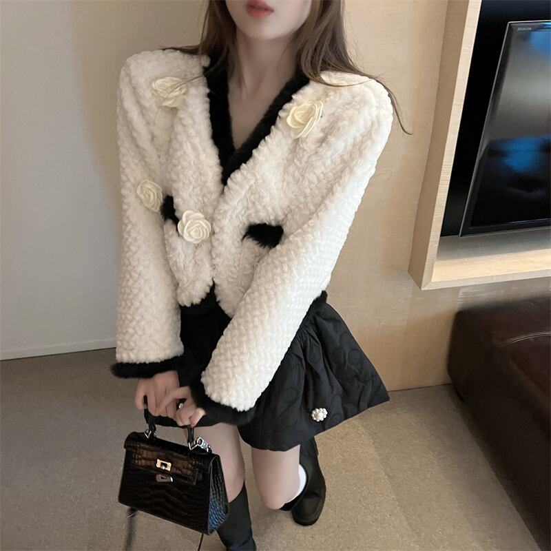ショートコート ホワイトルーズスタンダードFlowerデザイン ブラウス オータムウィンター レトロ 秋物 冬物 フラワーデザイン ブラックストロベリース67842272677