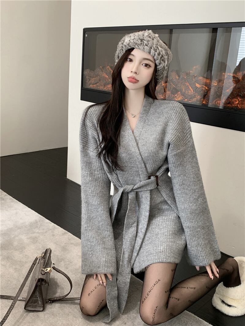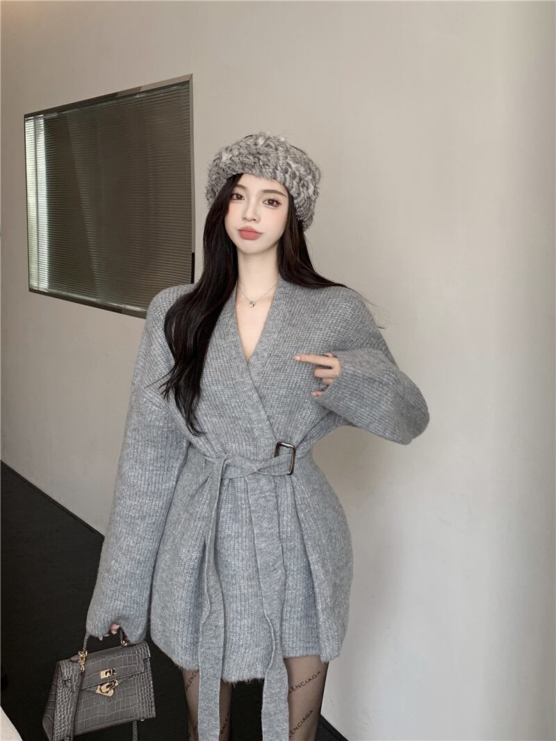 スタンダードスタイルウェストニットセーター カーディガンジャケット レディースオータムウィンターシャツ レトロ 秋物 冬物 ブラックストロベリース52217136515