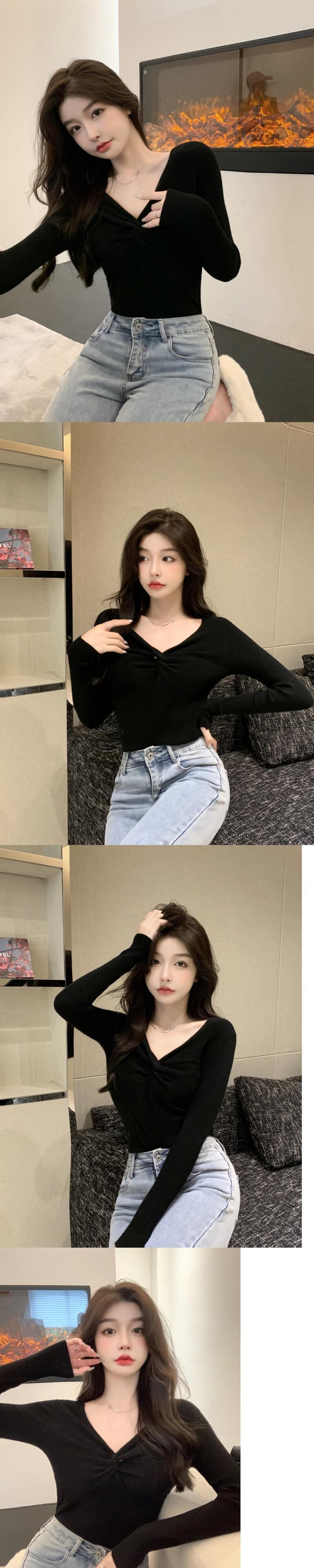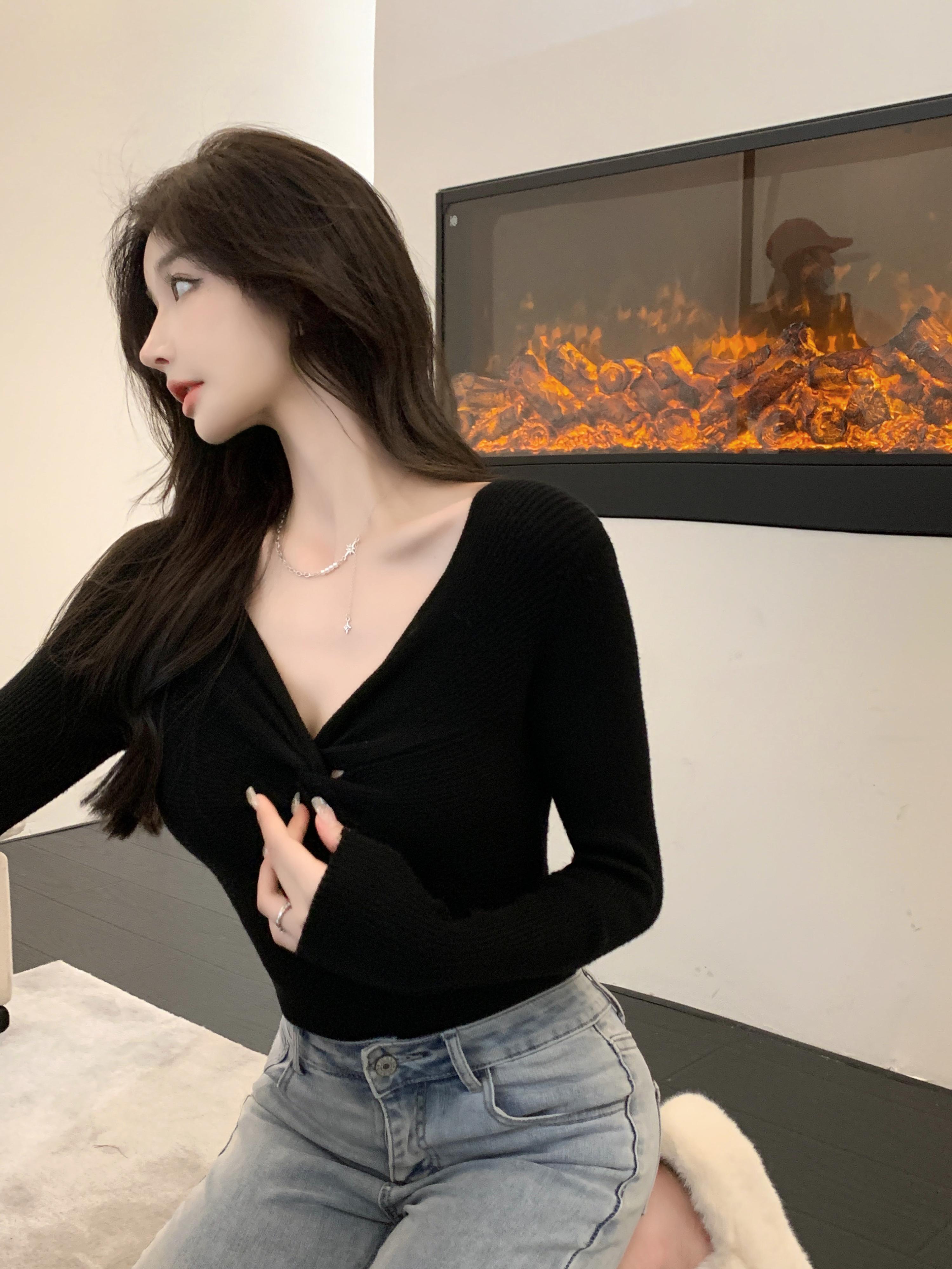 ニットセーター Vネックホワイトシャツ オータムウィンタートップス 秋物 冬物 ブラックストロベリース73948674624