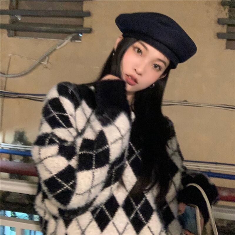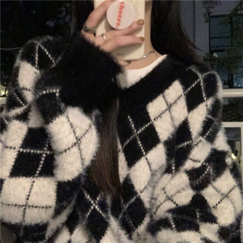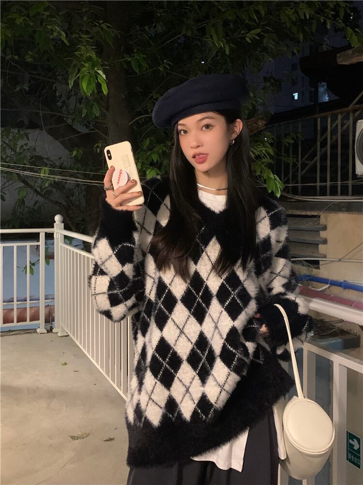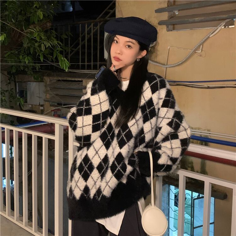 格子柄セーター ルーズスタイルスタンダードVネックトップス オータムウィンター レトロ 秋物 冬物 ブラックストロベリース15585434291