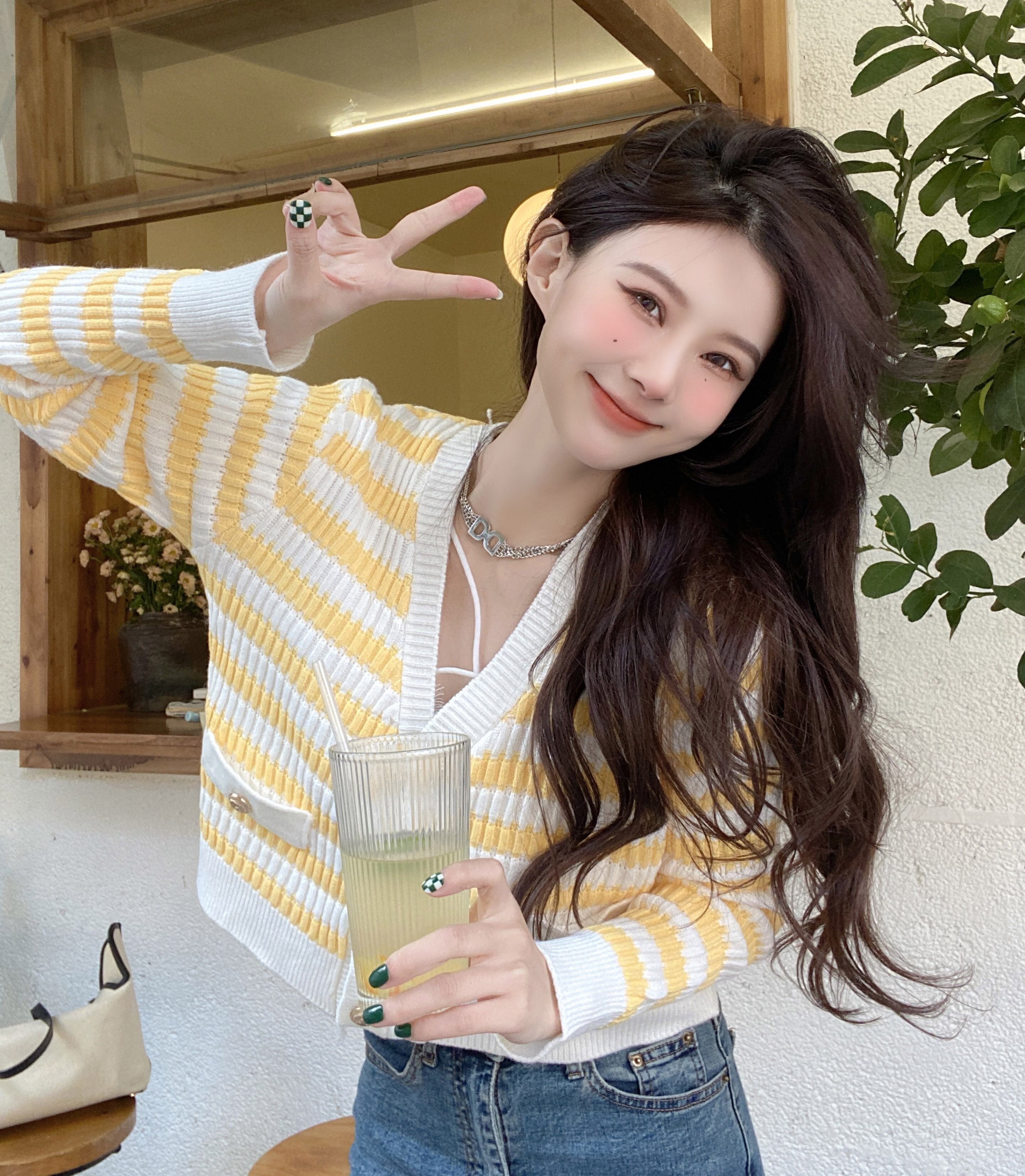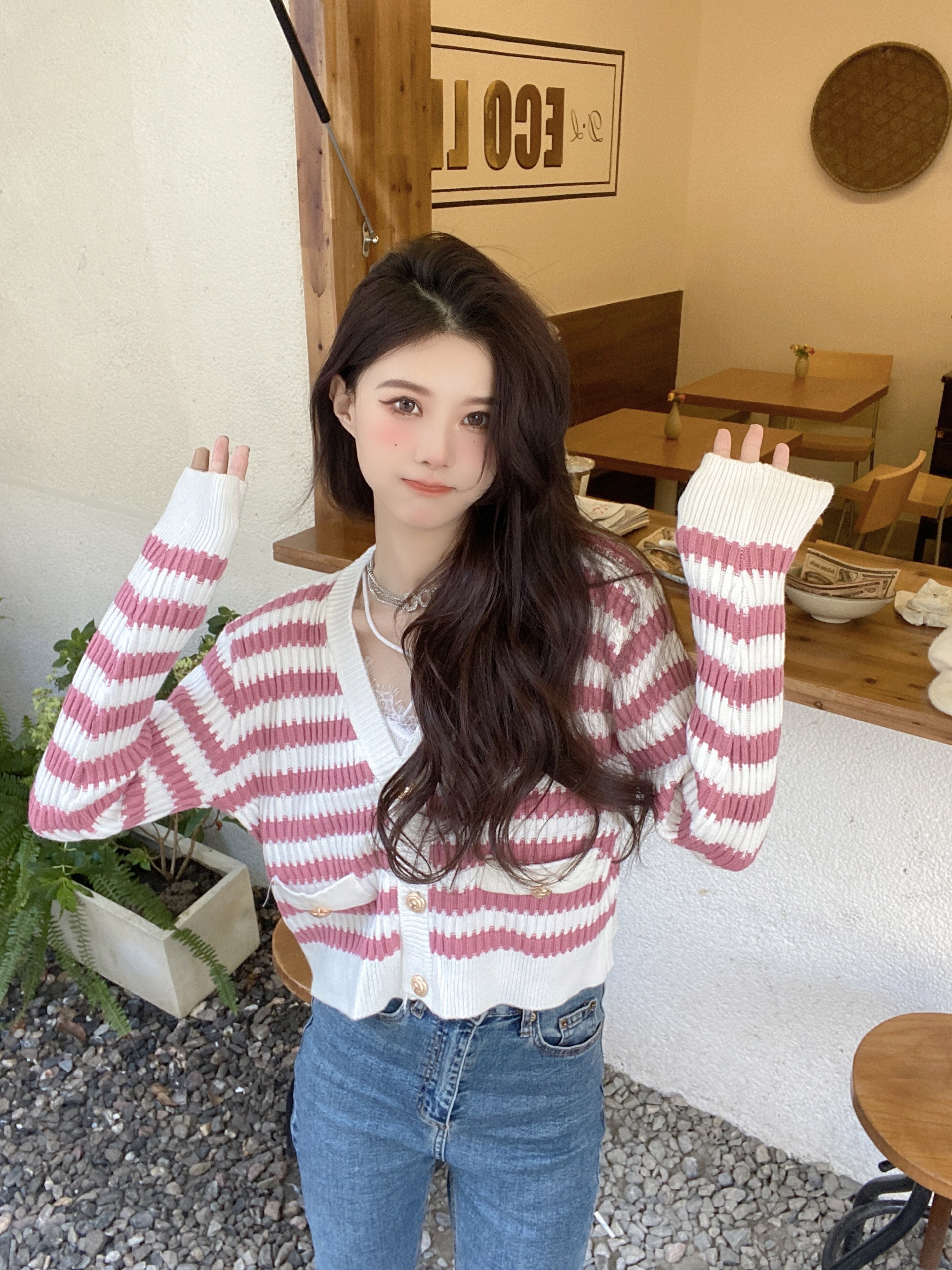 カラーストライプニットカーディガンジャケット オータムウィンターセーター ショートシャツ ロング 秋物 冬物 ブラックストロベリース5652702396